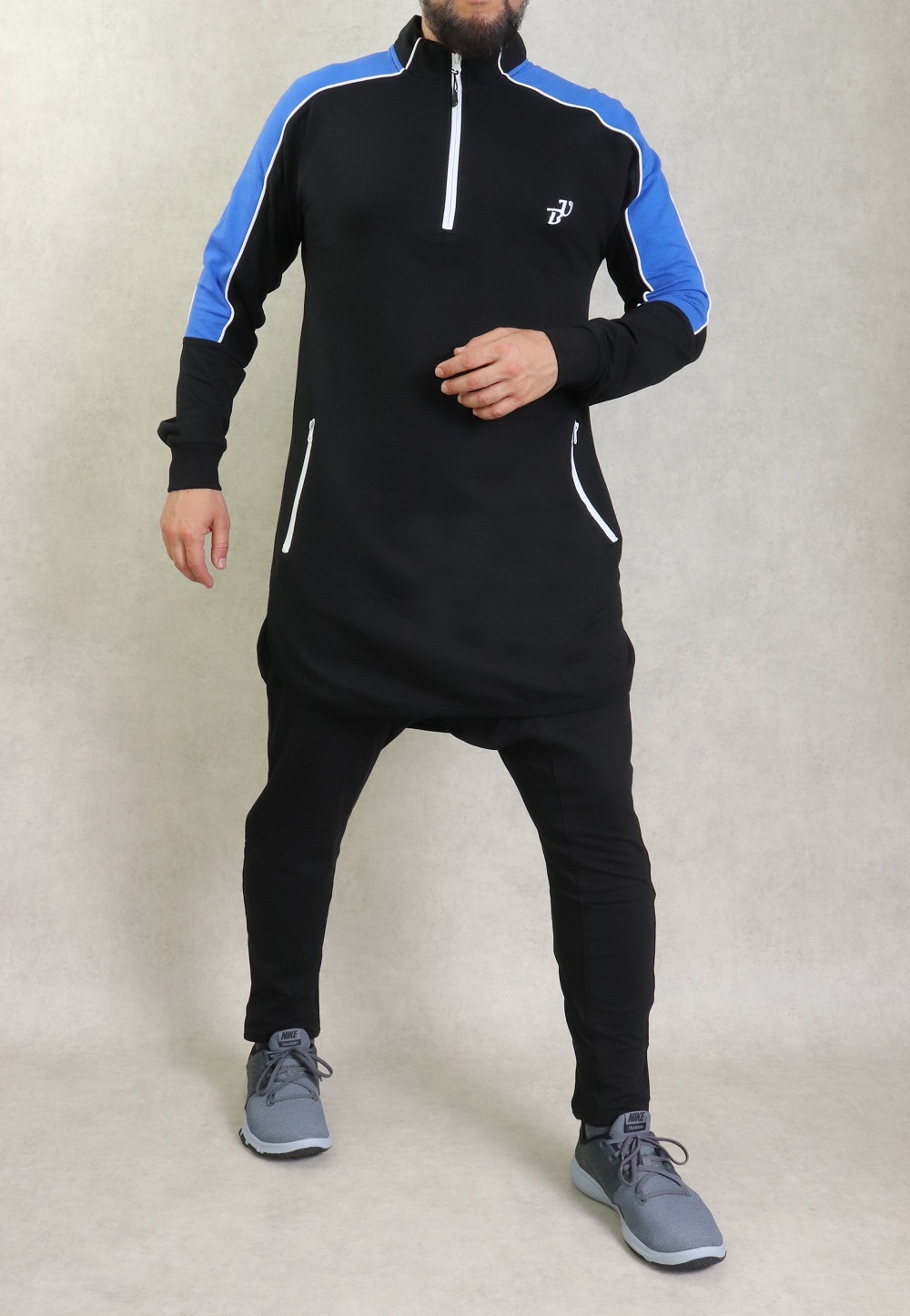Qamis court bicolore type sportswear. Deux poches latérales zip. Ouverture zip au niveau du cou. Tissu coton molletonné ultra-doux.