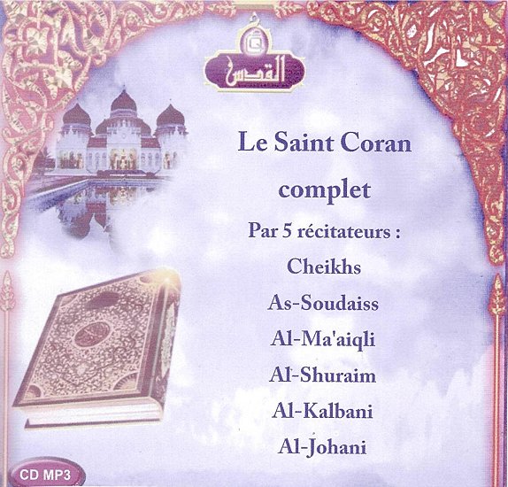 Le Coran complet au format MP3 Par 5 récitateurs : Soudaiss, Ma'aiqli, Shuraim, Kalbani, Johani.