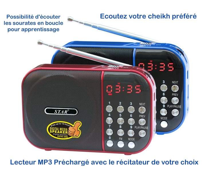 Le grand avantage de ce lecteur MP3 est son clavier qui vous permet d'accéder directement à un fichier MP3 en composant son numéro (ou numéro de la sourate). Sa technologie permet une écoute de plus de 15 heures sans recharger la batterie... On peut utiliser les écouteurs ainsi que les hauts parleurs d'excellente qualité.