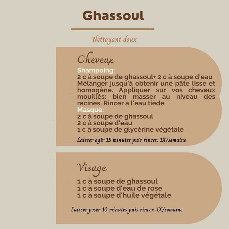 Conseils d'utilisation: Mélangez le ghassoul avec l'eau tiède afin d'obtenir une pâte, l'appliquez en masque sur la peau ou en frictions sur les cheveux, rincez.