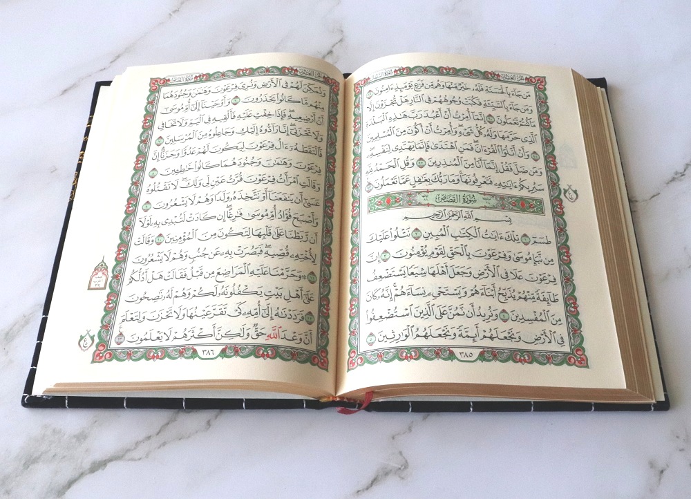 Le Saint Coran recouvert de velours brodé avec la forme de la Kaaba. Marque page intégré. Impression en plusieurs couleurs. Les pages sur le côté sont dorées.