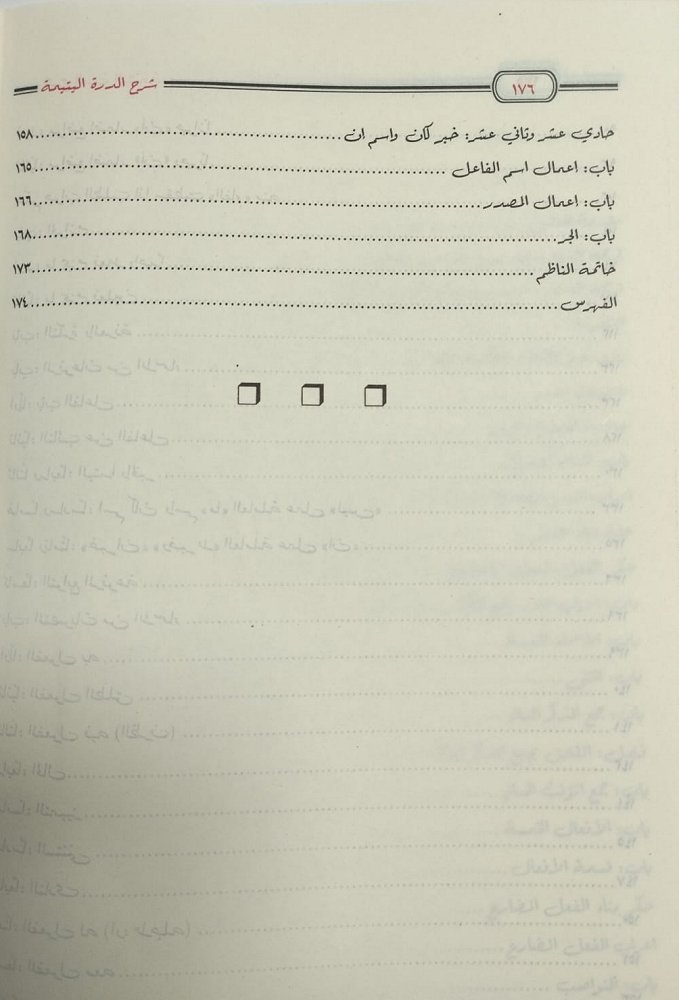 يحتوي على شرح لنظم (الدرة اليتيمة)؛ لمؤلفها الشيخ سعيد بن سعد التريمي الحضرمي (ت1354ﻫ)، وذلك بتوضيح معاني نصوصه، وتقريبها للمشتغلين بعلم النحو، وقد سجل هذا الشرح في جامع فضيلة الشيخ العلامة رحمه الله تعالى بعنيزة عام (1407ﻫ)، تضمن التسجيل الصوتي ما بين (علامات الفعل) و(باب المنصوبات من الأسماء).