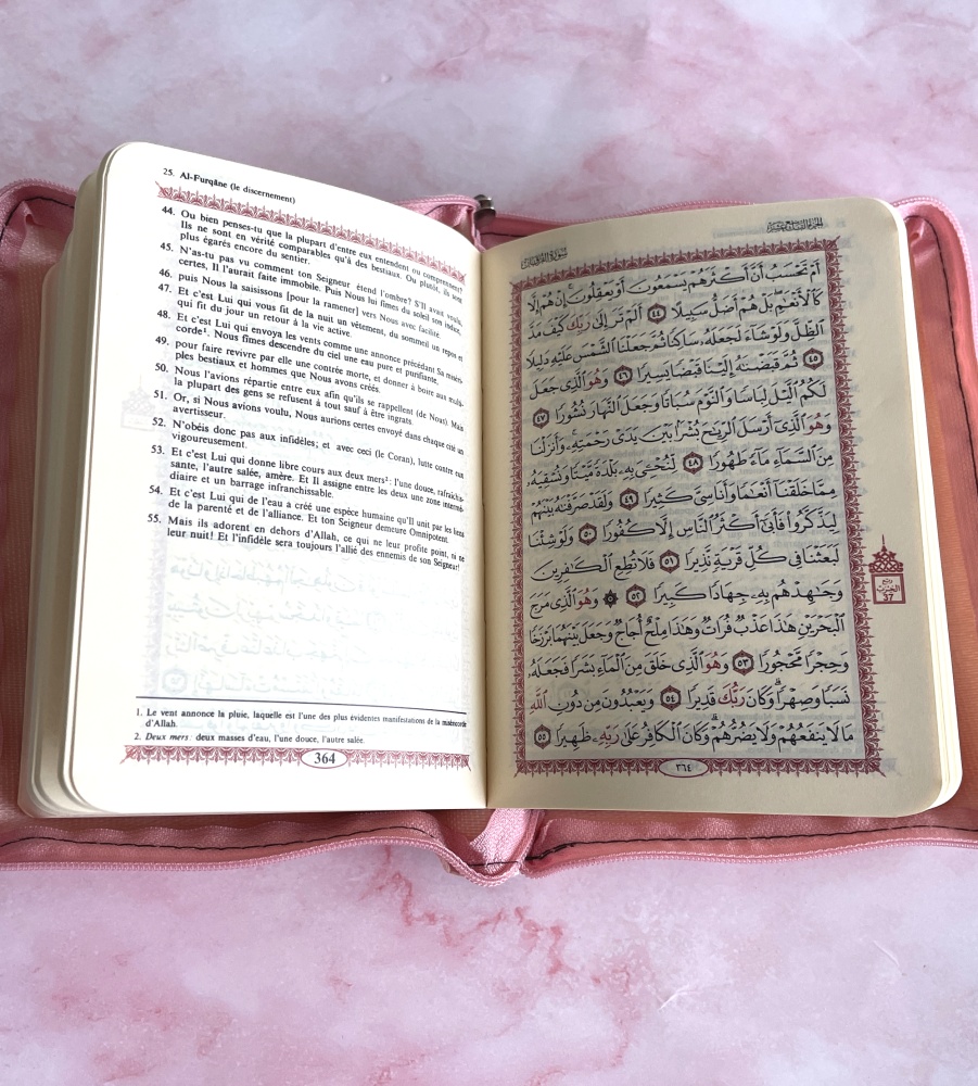 Le Saint Coran de poche bilingue (arabe-français) avec pochette fermeture zip (10 x 14 cm) - Rose