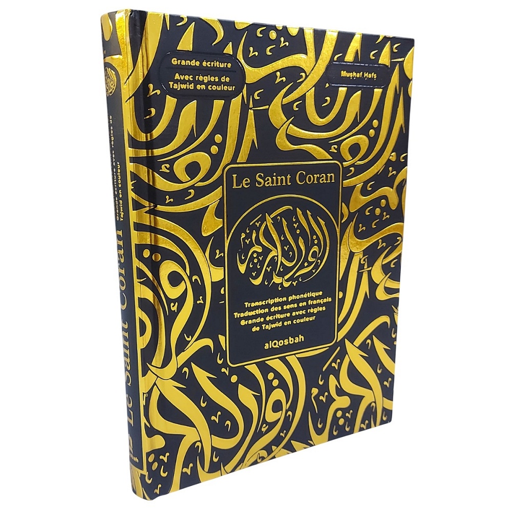 Le Saint Coran avec grands caractères - Transcription phonétique - Traduction des sens en français - Règles de Tajwîd en couleur et Vidéo CodeQR - Bleu doré (13,5 x 18 cm) - REF. 40926 (28.00 €)
