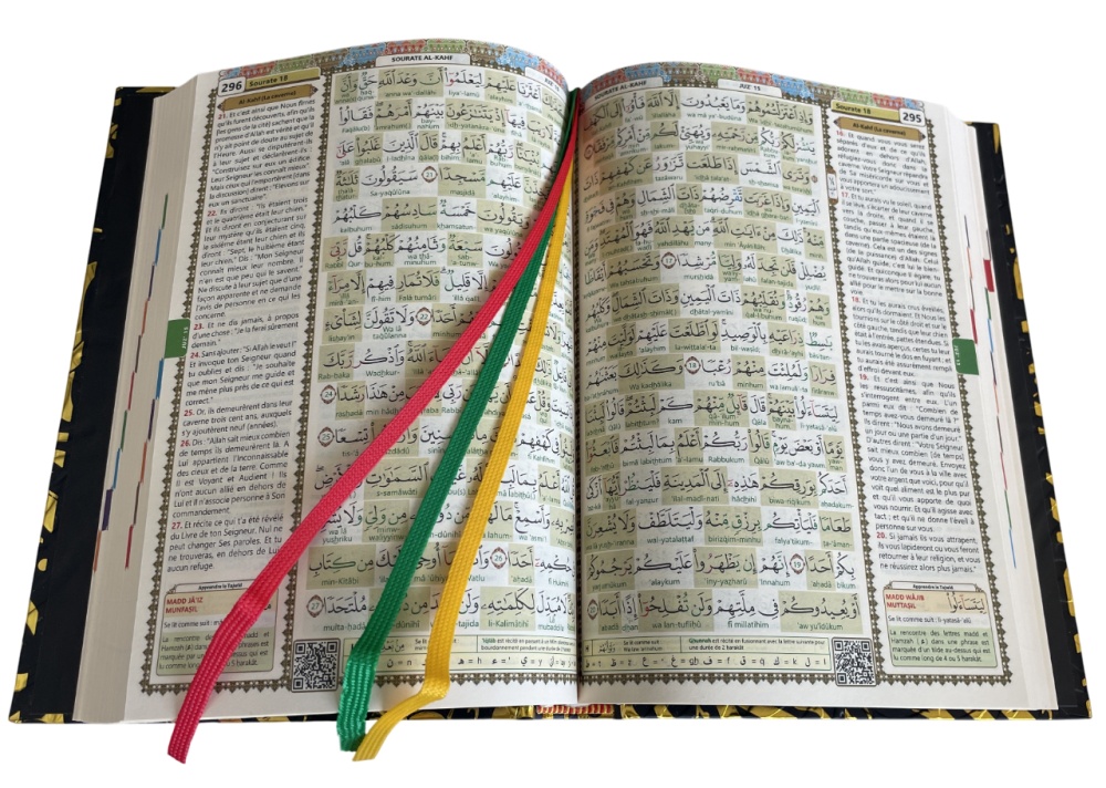 Les règles de tajwid sont données par un système de couleur intuitif pour apprendre les règles de lecture et de psalmodie du Saint Coran et le code QR (présent sur chaque page) permet d'ouvrir une vidéo sur son smartphone et d'écouter et suivre la lecture du Coran par cheikh Soudays.