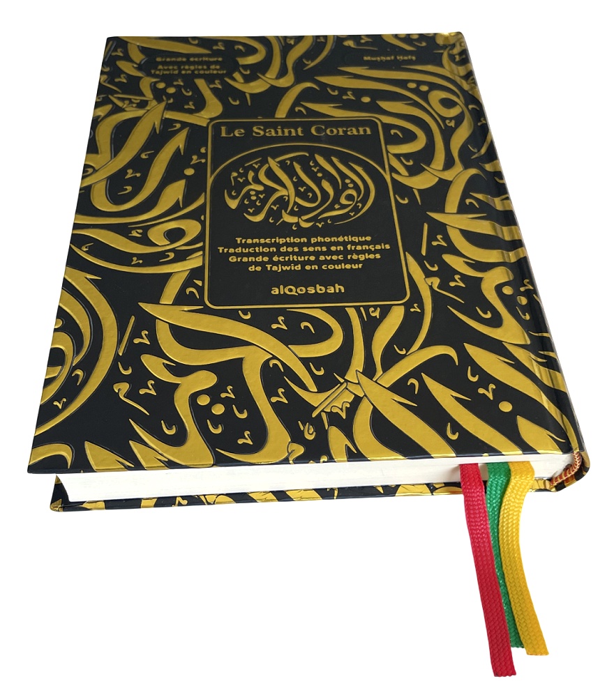 Le Saint Coran avec grands caractères - Transcription phonétique - Traduction des sens en français - Règles de Tajwîd en couleur - QR Code - Noir doré (13,5 x 18 cm) - REF. 40928 (29.90 €)