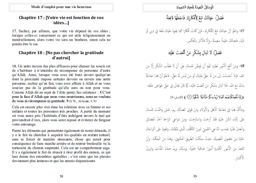 Que vous soyez en quête d’apaisement ou désireux de renforcer votre foi, ce livre vous accompagnera sur la voie de l'épanouissement. Car, en définitive, c'est Allah Seul qui accorde la réussite à ceux qui recherchent le bien et s'efforcent de fuir ce qui nuit à l'âme.