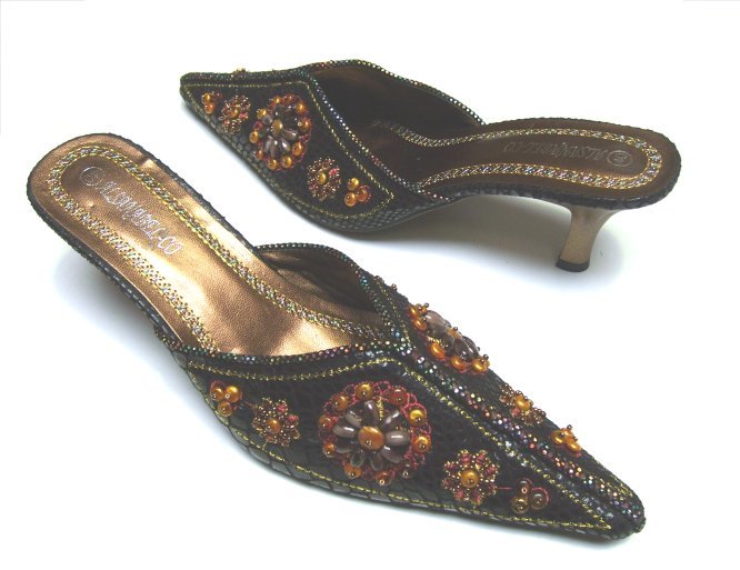 Ces sabots à petit talon, une touche très chic pour les femmes qui ne supportent pas les talons vertigineux, notez la tendance des perles et strass multicolores. Cette très belle paire de mules orientales brunes et brillantes avec perles et broderies, à bout pointu se marient parfaitement avec tous types de robes.