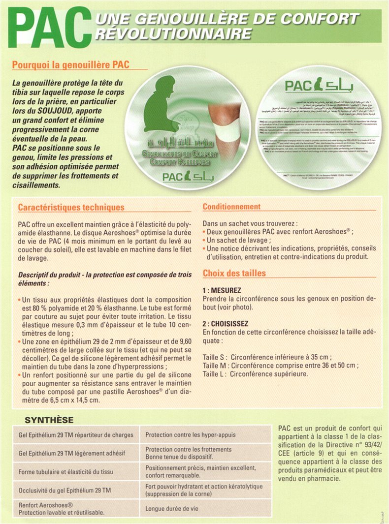 PAC est une protection de la tête tibiale (partie supérieure du tibia) qui s'avère fortement sollicitée en position agenouillée, lors de génuflexions répétées, particulièrement lors du SOUJOUD. De par ses caractéristiques de répartition des charges, le gel de silicone Epithelium 29TM de 2 mm d'épaisseur limite les pressions et son adhésion optimisée permet de supprimer frottements et cisaillements. La genouillère limite la formation de corne et soulage la douleur (soulage l'arthrose des genoux).