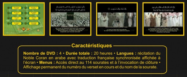 Chaque DVD possède un menu permettant un accès direct à la sourate désirée. Le 4e DVD contient en plus l’invocation de clôture du Coran. Les versets sont affichés simultanément en arabe et en français, verset par verset, parallèlement aux prières de Tarawîh.