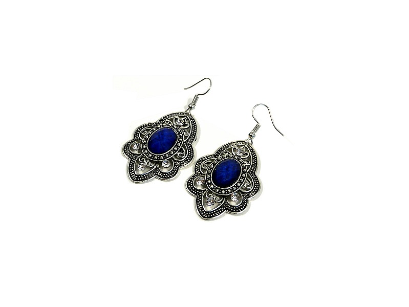Boucles d'oreilles pendantes, style berbère, fabriquées en métal argenté - composition argent - délicatement ciselé, serties de pierres bleu roi.