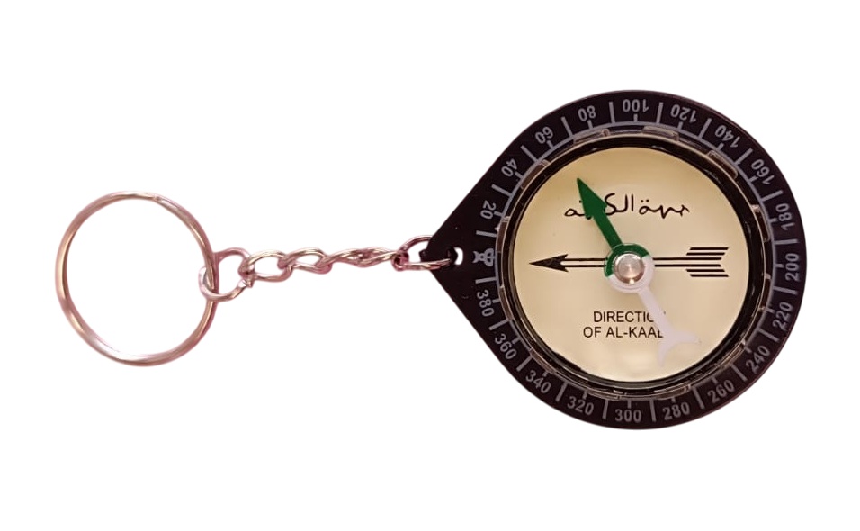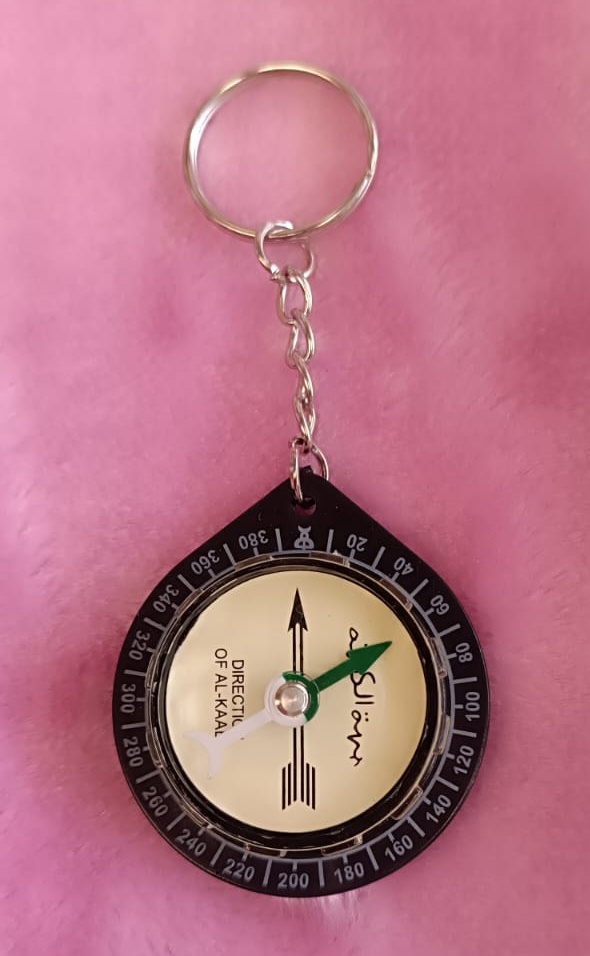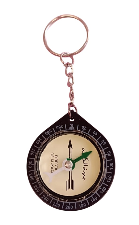 Boussole porte-clés classique indiquant la direction de La Mecque avec une très bonne précision. Simple à utiliser et rapide. Nous rappelons que pour la France il faut positionner l'aiguille verte sur 260 (puis la direction de La Mecque est indiquée par par la flèche noire - voir photo)