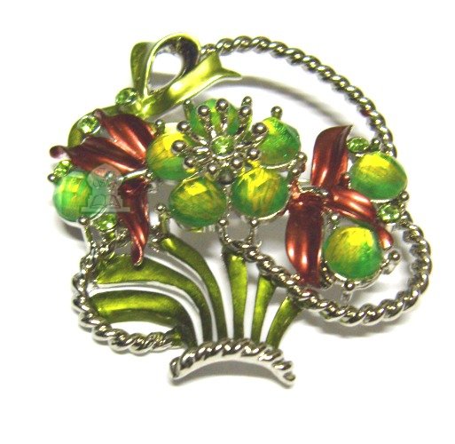 Broche argentée en forme de bouquet de fleurs tricolore (vert-rouge-jaune) avec perles vertes pour Hijab.