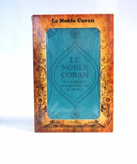 Le Noble Coran avec couverture cartonnée de type cuir, doux au toucher. Très jolie couleur tirant vers le bleu. Idéal pour offrir. Avec sa boite cadeau.
