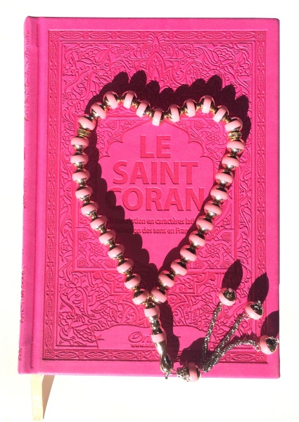 Coffret Cadeau pour femmes - Le Saint Coran (francais-arabe-phonetique) et Chapelet "Sebha" de luxe roses