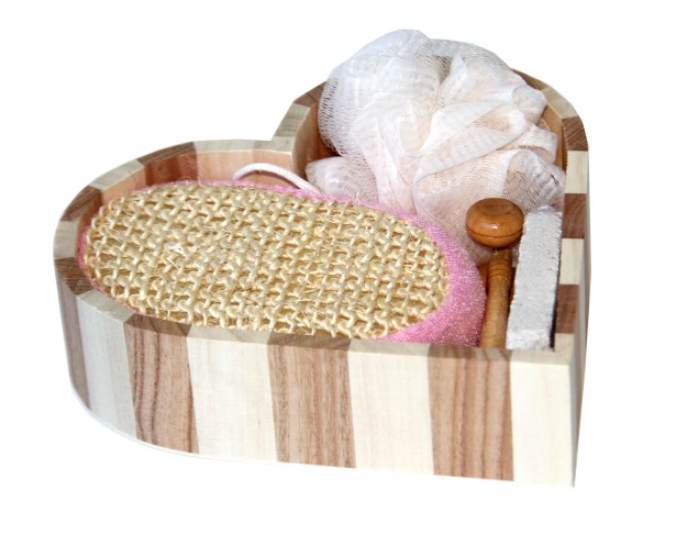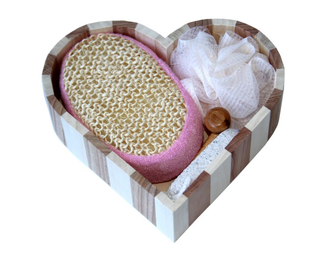 Ensemble complet pour bain et hammam dans un panier en bois sous forme de coeur...