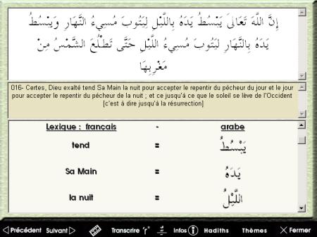 Spécialement conçu pour un public francophone, ce cédérom exploite les techniques du multimedia pour l'apprentissage de la langue arabe, du Saint Coran, des Hadiths et dou'a du Prophète (BSDL) ainsi que du vocabulaire islamique que l'on retrouve dans les livres de Fiqh (jurisprudence).