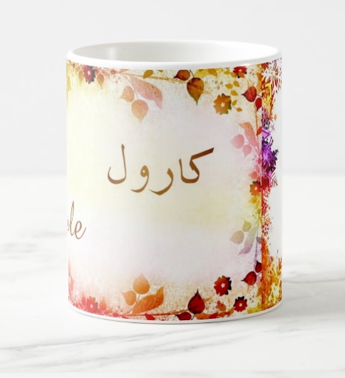Mug avec le prénom Carole calligraphié en arabe ainsi que son écriture normale en arabe (كارول) et en français.