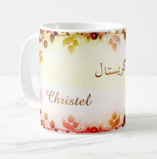 Mug avec le prénom Christel calligraphié en arabe ainsi que son écriture normale en arabe (كريستال) et en français.