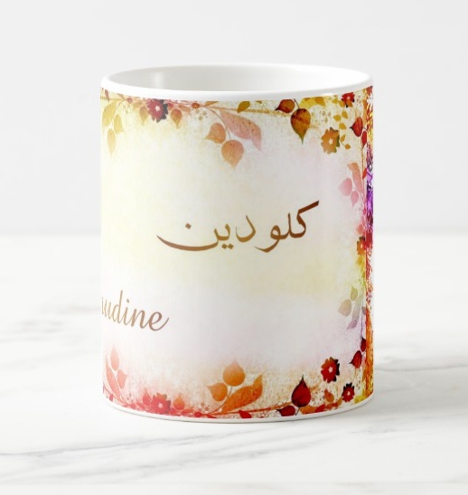 Mug avec le prénom Claudine calligraphié en arabe ainsi que son écriture normale en arabe (كلودين) et en français.