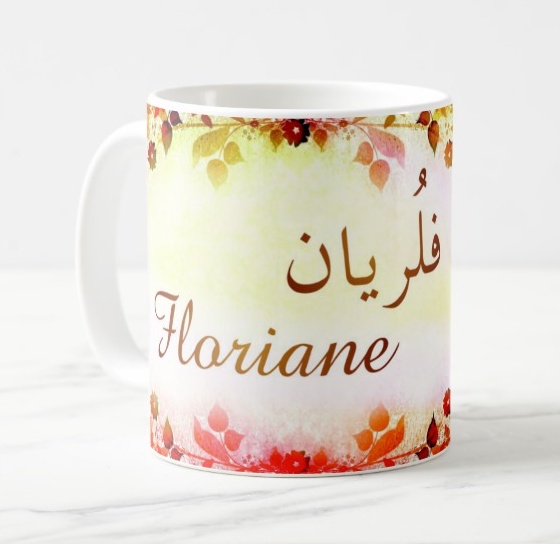 Mug avec le prénom Floriane calligraphié en arabe ainsi que son écriture normale en arabe (فلريان) et en français.