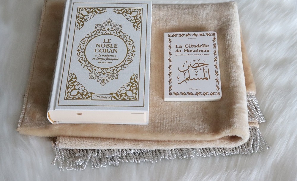 Un cadeau qui ne passera pas inaperçu. Les deux livres sont de couleur blanche dorée. Le tapis est de couleur beige.