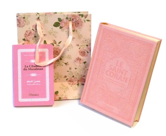 Pack cadeau rose pour femmes : Le Saint Coran (français/arabe/phonétique) + La Citadelle du Musulman + Porte coran (assortis) - REF. 23550 (35.00 €)