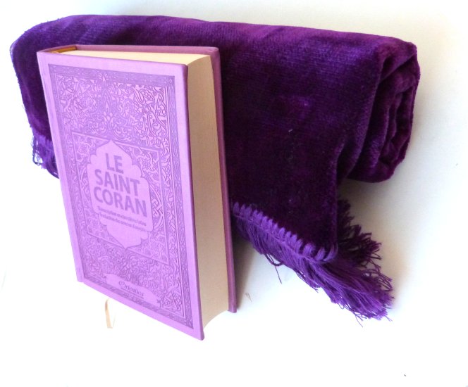 Pack cadeau pour femmes : Le Saint Coran (arabe-français-phonétique) avec couverture cuir de luxe (mauve) + Tapis unis en velours couleur mauve Livre
