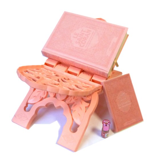 Pack Cadeau femme constitué d'un Coran couverture cuir de luxe (rose) + Joli Porte-Coran en bois sculpté et décoré + Parfum Musc d'Or de luxe (8 ml) - REF. 22929 (35.00 €)