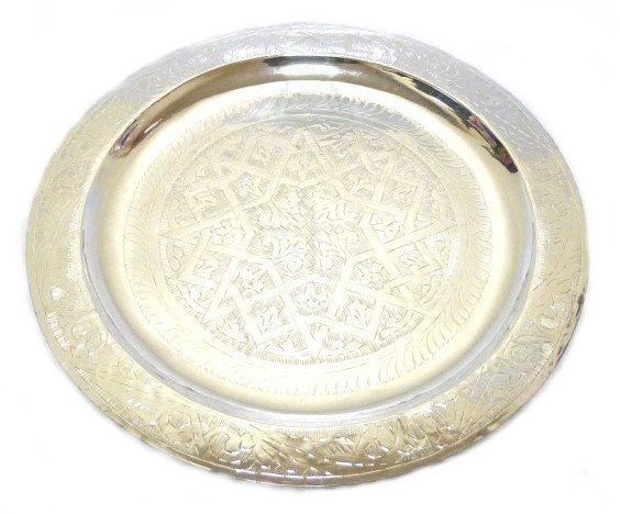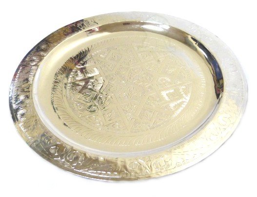 Plateau rond marocain moyen de fabrication artisanale en métal argenté cerclé et finement ciselé - 35 cm de diamètre - REF. 15865 (18.00 €)