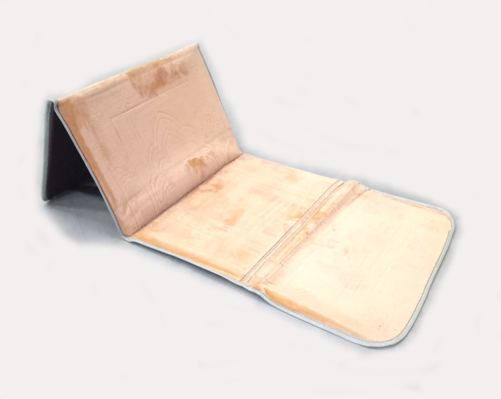 Tapis de prière musulman rembouré pliable et transportable avec sa sacoche de transport. Par une simple manipulation, se transforme rapidement de tapis à repose-dos (chaise, dossier, adossoire...)