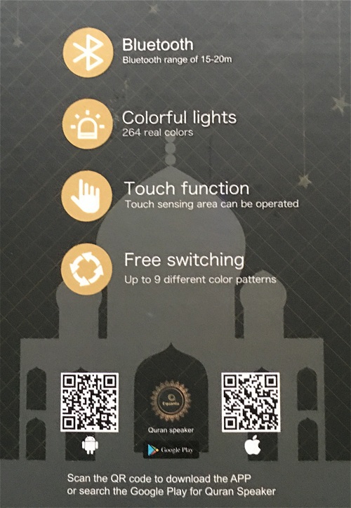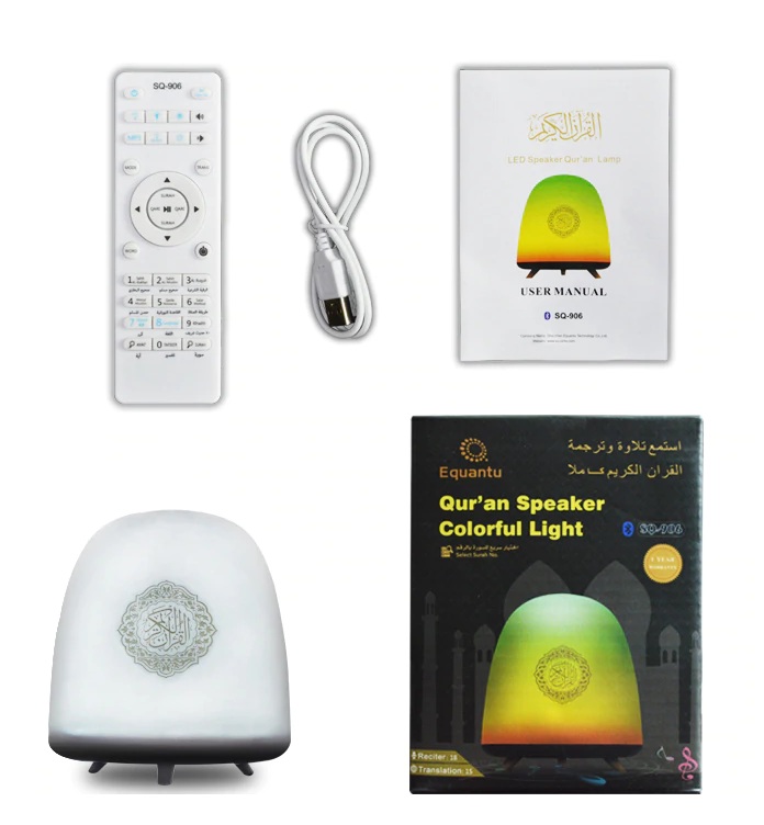 Main Function: Touch lamp, Learning, Quran reciter, Translations, MP3, Recording, FM.