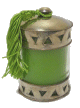 Photophore / Bougeoir en verre avec bougie cerclée de métal argenté ciselé terminé d'un pompon en Sabra - Modèle vert - REF. 16863 (9.90 €)